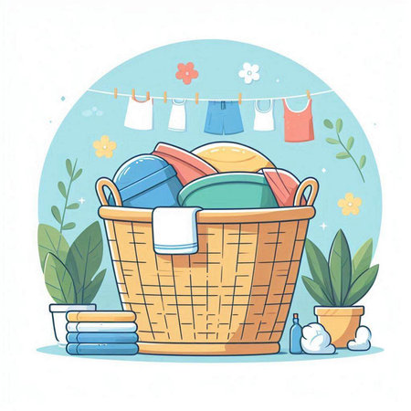 Colorful vector illustration of a basket full of clothes and accessories.