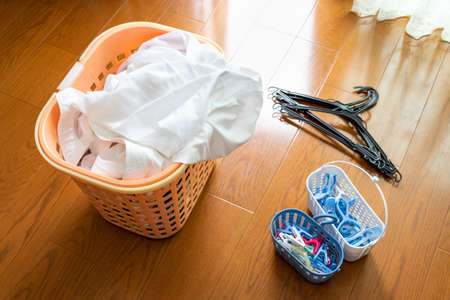 Laundry, clothes pins and hanger by the window in the room