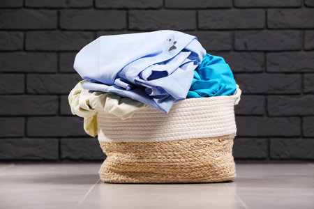 Laundry basket with clothes near black brick wall