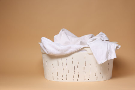 Plastic basket full of laundry against light brown background
