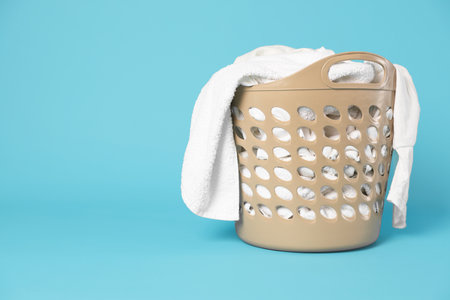 Plastic basket with laundry on light blue background, space for text