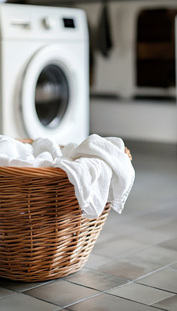 Wicker basket overflowing with clean white lines next to a sleek modern washing machine