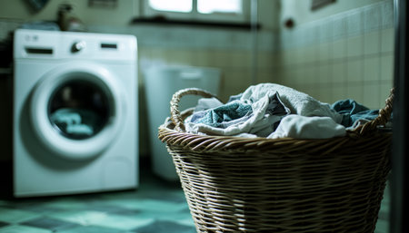 Laundry room scene featuring a basket of clothes with a washing machine in the background