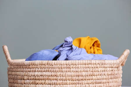 Basket with laundry on gray background, closeup
