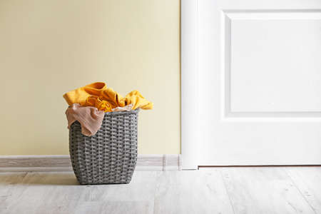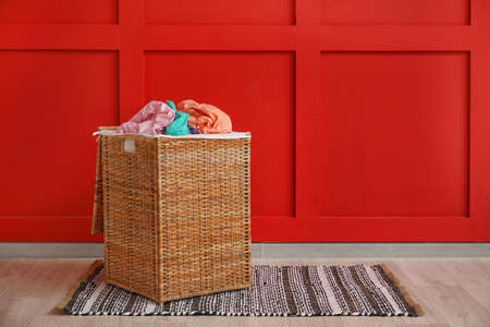Wicker basket with laundry near color wall