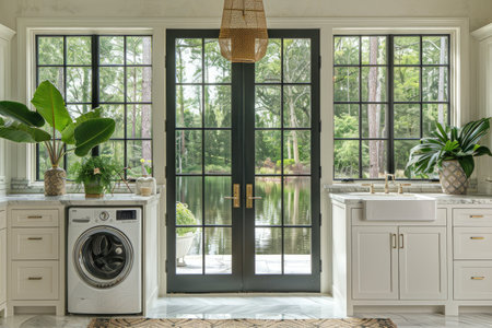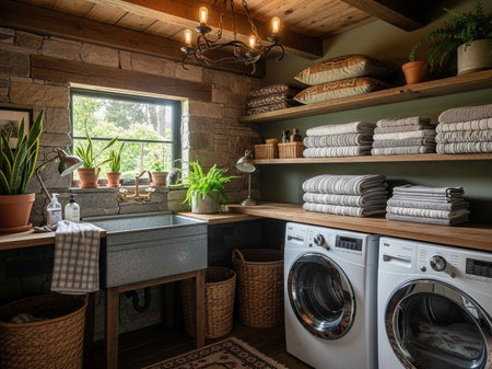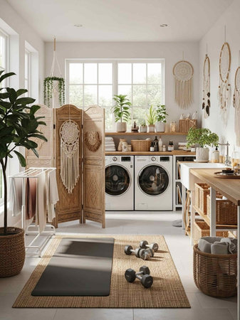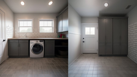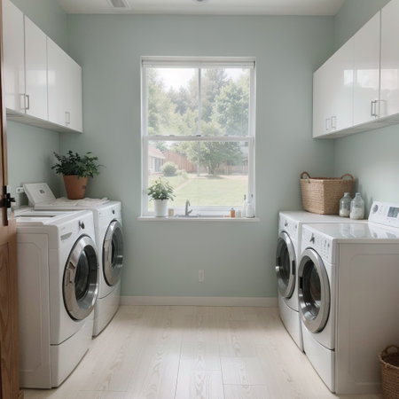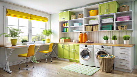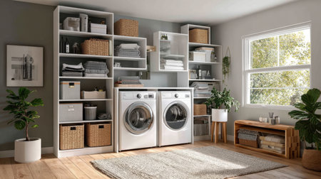 Bright and stylish laundry room featuring organized storage and modern design. Natural light enhances the cozy ambiance, perfect for household tasks and relaxation.