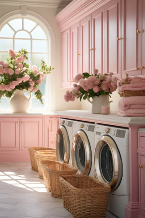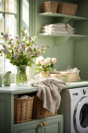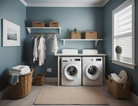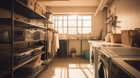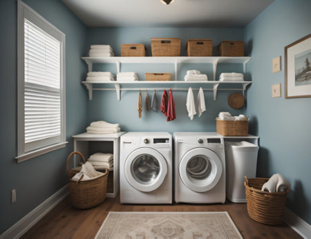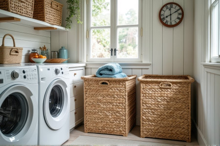 Cozy laundry room with wicker baskets and modern washer and dryer by sunlit window. That the image is generated using AI.