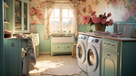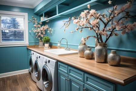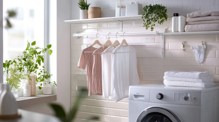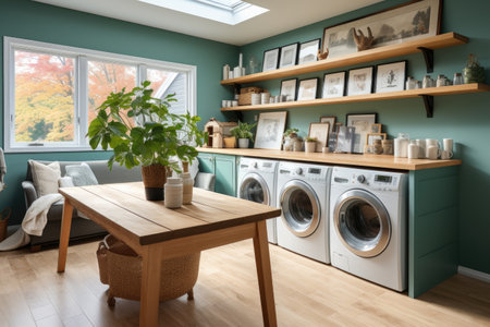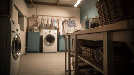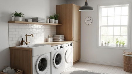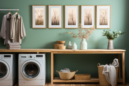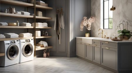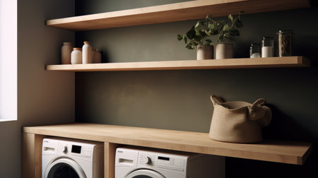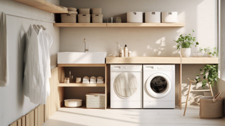 Generative AI A Scandinavian-inspired laundry area with light wood accents, functional design, and a serene, clutter-free environment. photorealistic
