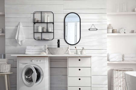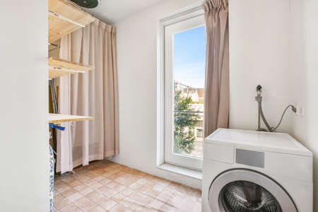 Interior of home laundry room with modern washing machine with a beautiful wooden shelf