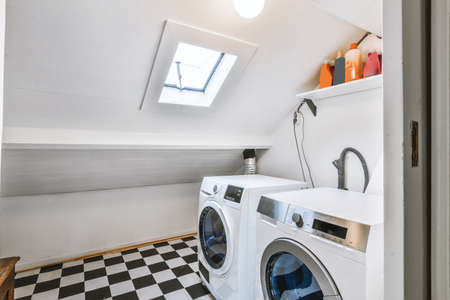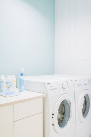 Interior of a modern laundry room with washing machines and detergents on a shelf
