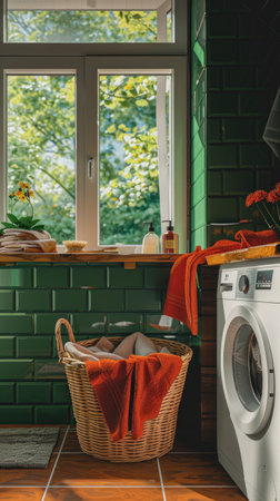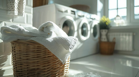 A Laundry Basket Filled with Towels Stands Beside a Washing Machine in Natural Light