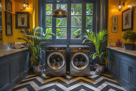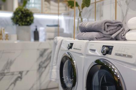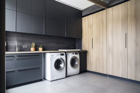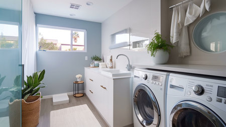 Contemporary laundry room with modern appliances including washer and dryer set, AI Generative.