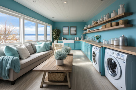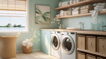 A coastal-themed laundry room with beachy colors, wicker baskets, and a beach-inspired wallpaper accent wall. Generative AI
