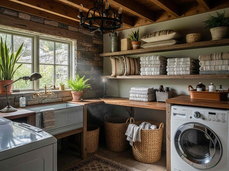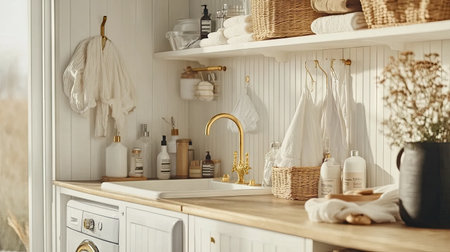 A charming laundry room designed with a bright palette, wooden countertops, gold accents, and natural decor creating a warm and inviting space.