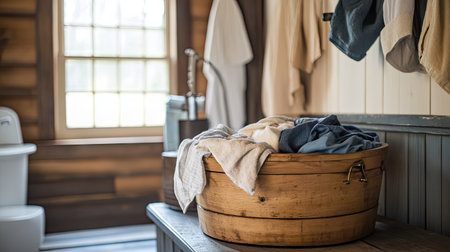 A rustic laundry room featuring a wooden laundry basket overflowing with dirty clothes and towels
