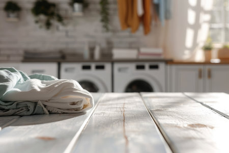 Stacked clean washed clothes on wooden board against background with washing machine in home laundry