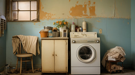 a laundry room featuring a laundry machine and basket, captured with a pentax 645n camera. the photo showcases torn, distressed edges and atmospheric color washes in light blue and amber tones. this associated press photo highlights the use of living materials and post-apocalyptic backdrops. ai generated