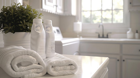 Home Laundry Room with Detergent Bottles and Folded Towels