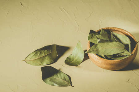 spices of bay leaf in rural style on a light background.