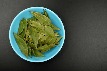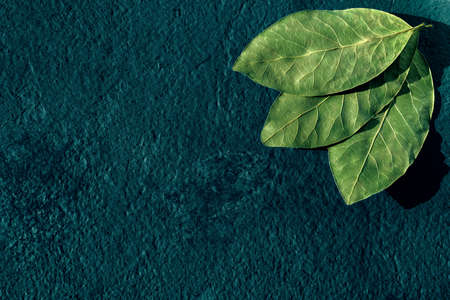 bay leaves on blue background.