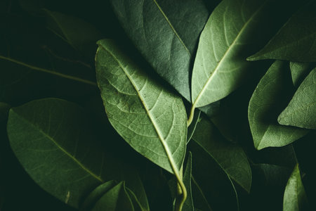 Green bay leaves are arranged densely, revealing their smooth surfaces and vibrant colors. The image highlights the natural texture and organic details of these culinary herbs.