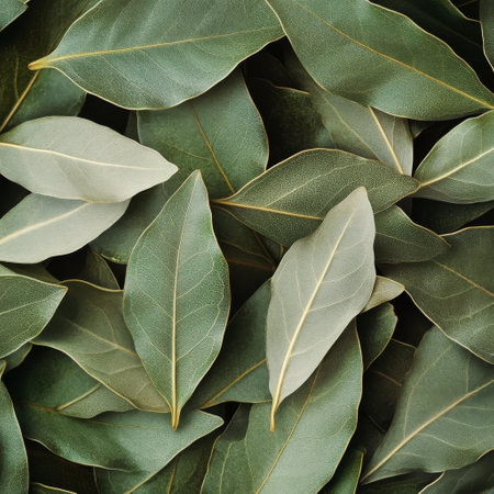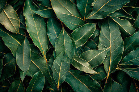 Fresh bay leaves are layered closely together, highlighting their rich dark green color and smooth texture. The natural beauty of the leaves emphasizes their culinary and aromatic uses.