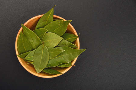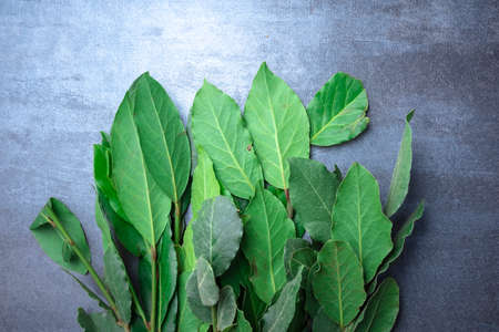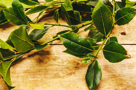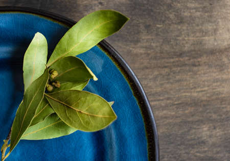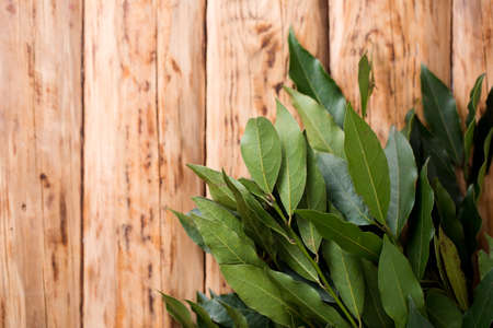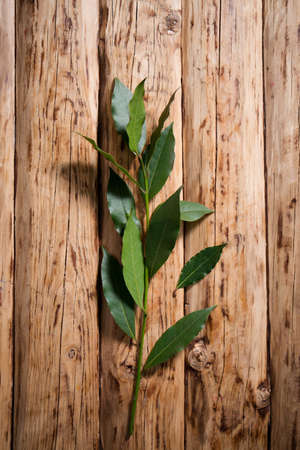 Fresh young bay leaf. Traditional ingredient for cooking. Old wooden background