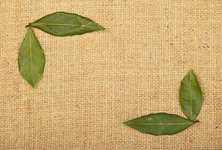 Frame of two groups of green bay laurel leaves in corners on brown burlap jute canvas background
