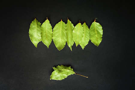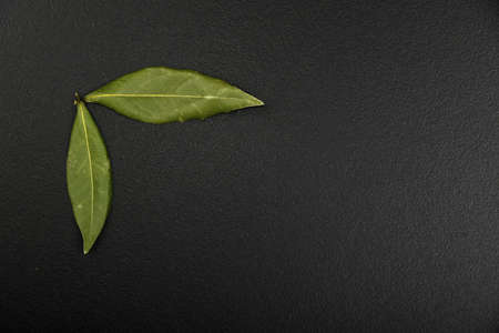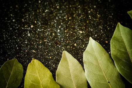 Bay leaves on a black marble desk closely
