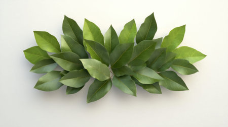 This image showcases a meticulously arranged pattern of green leaves. The leaves are carefully placed in a circular formation, creating a visually appealing design. The leaves vary in size and shape, adding to the natural beauty and complexity of the arrangement. The background is plain white, which highlights the vibrant green color and intricate details of the leaves.