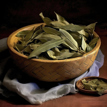Bay leaves in a wooden bowl on a wooden table with a cloth