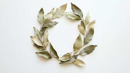 A beautiful dried bay leaf wreath arranged in a circular shape on a white background. Ideal for home decor or natural craft projects, showcasing elegant simplicity.