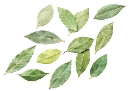 Dry bay leaves isolated on white background. Dried laurel leaf seasoning collection top view