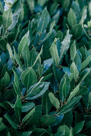 Bay laurel, Laurus nobilis, evergreen tree with green glossy leaves