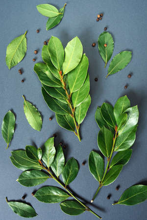 twigs with bright laurel leaves and black peas pepper on a gray background for a culinary background, cover, screensaver. Vertical