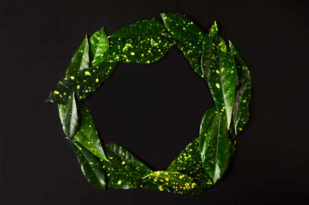 Round frame with green leaves on dark, black background. Top view, copy space, flat lay. Creative concept for your design.