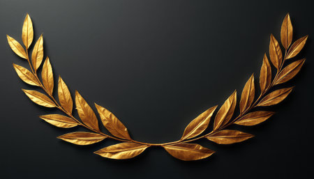 This stunning image showcases a beautifully crafted golden laurel wreath, gracefully arching against a deep black backdrop. The intricate details of the leaves shimmer with a luxurious glow, symbolizing victory and achievement, making it a perfect emblem for awards and celebrations.