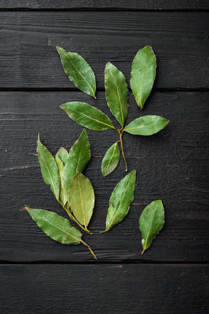 Fresh bay leaves set, on black wooden table background, top view, flat lay