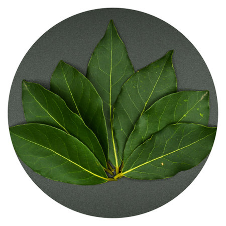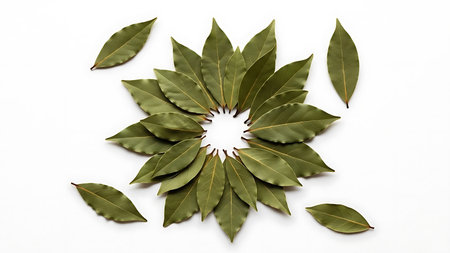 A stunning arrangement of bay leaves in a circular pattern on a light background, emphasizing their texture and natural beauty for culinary uses.