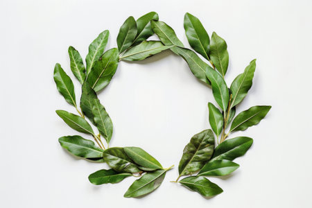 A circular arrangement of vibrant bay leaves creates a natural wreath, showcasing the rich green hues against a soft, neutral backdrop, perfect for adding a touch of nature to any space.