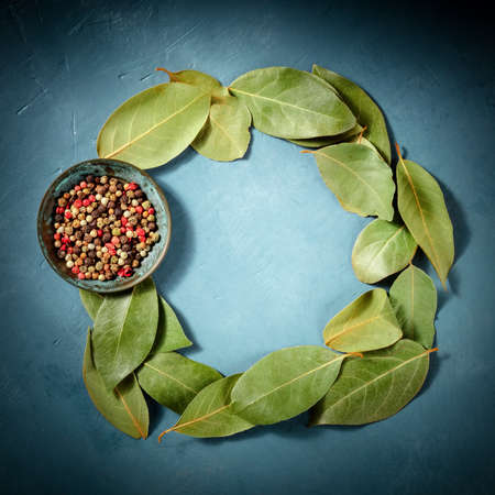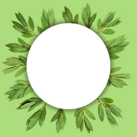 Culinary frame with a place for text. A wreath of bay leaves, shot from the top