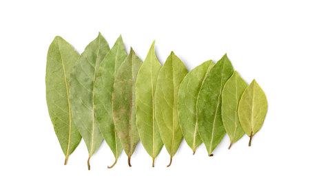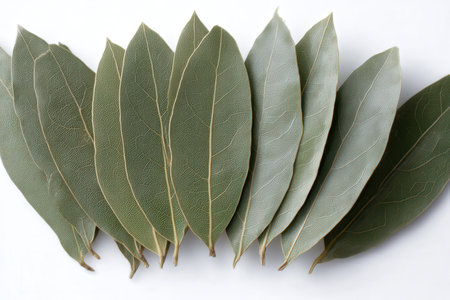 Row of Bay laurel leaves on a white background
