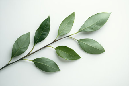 A branchs of fresh green laurel bay leaves on a white background. Top view. Copy space. Vertical