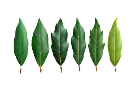 A collection of six distinct green bay leaves, each with unique characteristics, neatly aligned against a pristine white backdrop, emphasizing their culinary and aromatic appeal.