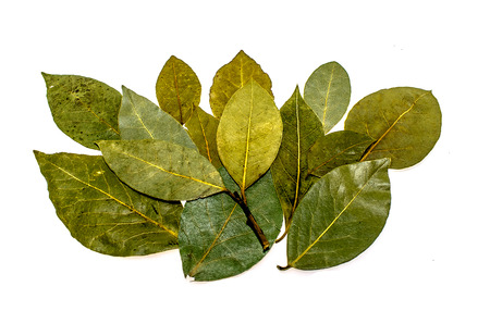dry bay leaves on a white background.
