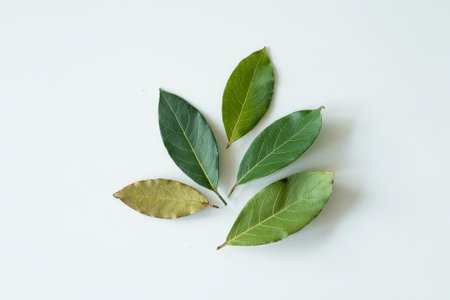 Close up shot of the bay leaves on the white background