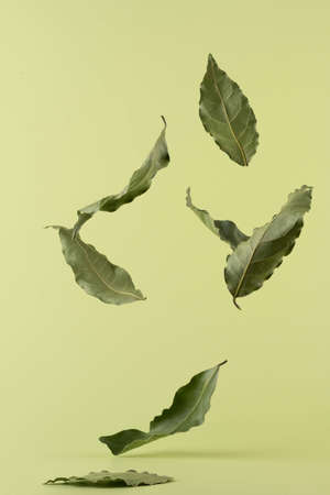 levitating laurel leaves on a green background.