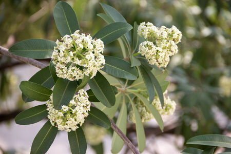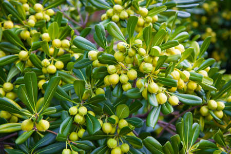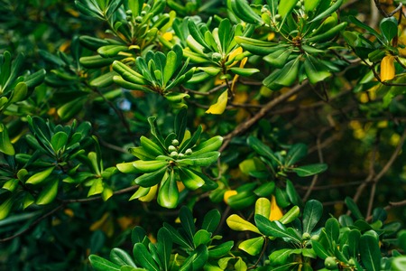 Shrubs and trees Pittosporum in Montenegro. Landscaping design of the hotel.