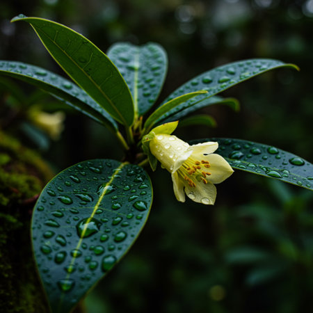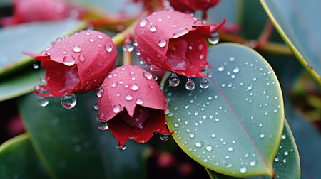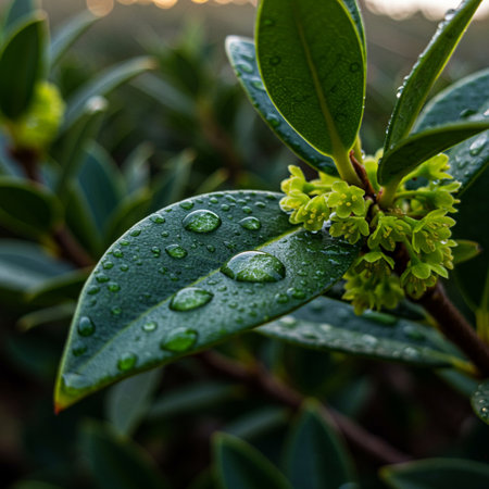 Lush and vibrant green leaves adorned with raindrops glistening in the sunlight