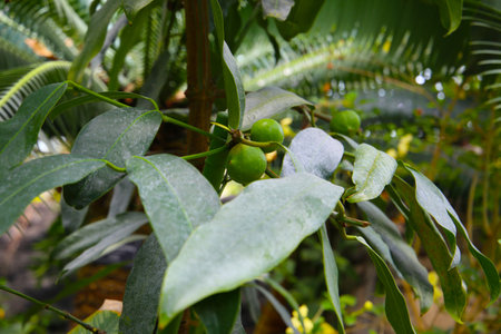 Ardisia elliptica (shoebutton ardisia, duck's eye and coralberry, lempeni) with a natural background. In Thai traditional medicine, the fruits are used to cure diarrhoea with fever.